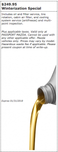 Plus applicable taxes. Valid only at PASSPORT MAZDA. Cannot be used with any other applicable offer. Mazda vehicles only. Prices may vary by model. Hazardous waste fee if applicable. Please present coupon at time of write-up.