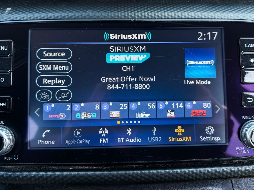 • Radio: AM/FM Audio System -inc: 8" color touchscreen display w/6 speakers, Bluetooth® hands-free phone system, streaming audio via Bluetooth®, Siri eyes free, audio and Bluetooth® steering wheel switches, 3 USB ports (1x front charge and data and 2x rear charge only), type C USB (data and charge) (front), NissanConnect featuring Apple CarPlay, Android Auto, SiriusXM satellite radio w/advanced audio features and hands-free text messaging assistant
