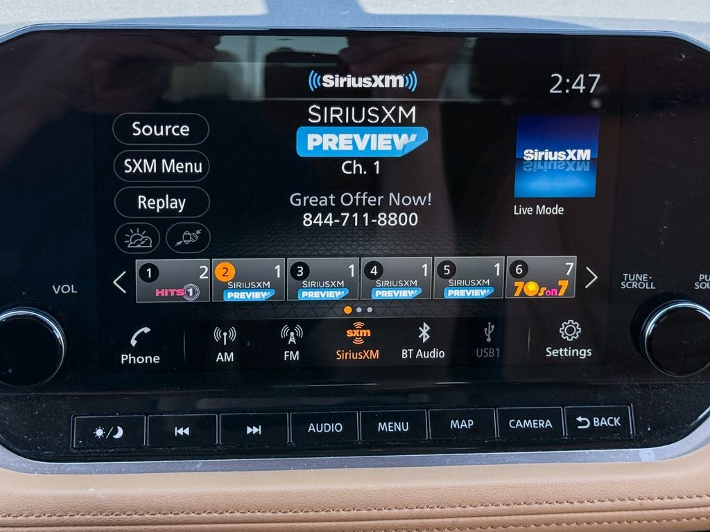 - Radio: AM/FM NissanConnect w/Navigation -inc: Nissan door to door navigation w/3D building graphics and satellite imagery featuring online POI search and online premium traffic information, SiriusXM Traffic, SiriusXM Travel Link, 9" color display w/multi-touch control, NissanConnect featuring Apple CarPlay and Android Auto, SiriusXM Satellite Radio, 2 illuminated USB connection ports (1 type-A, 1 type-C), Bluetooth® hands-free phone system, streaming audio via Bluetooth® and hands-free text messaging assistant